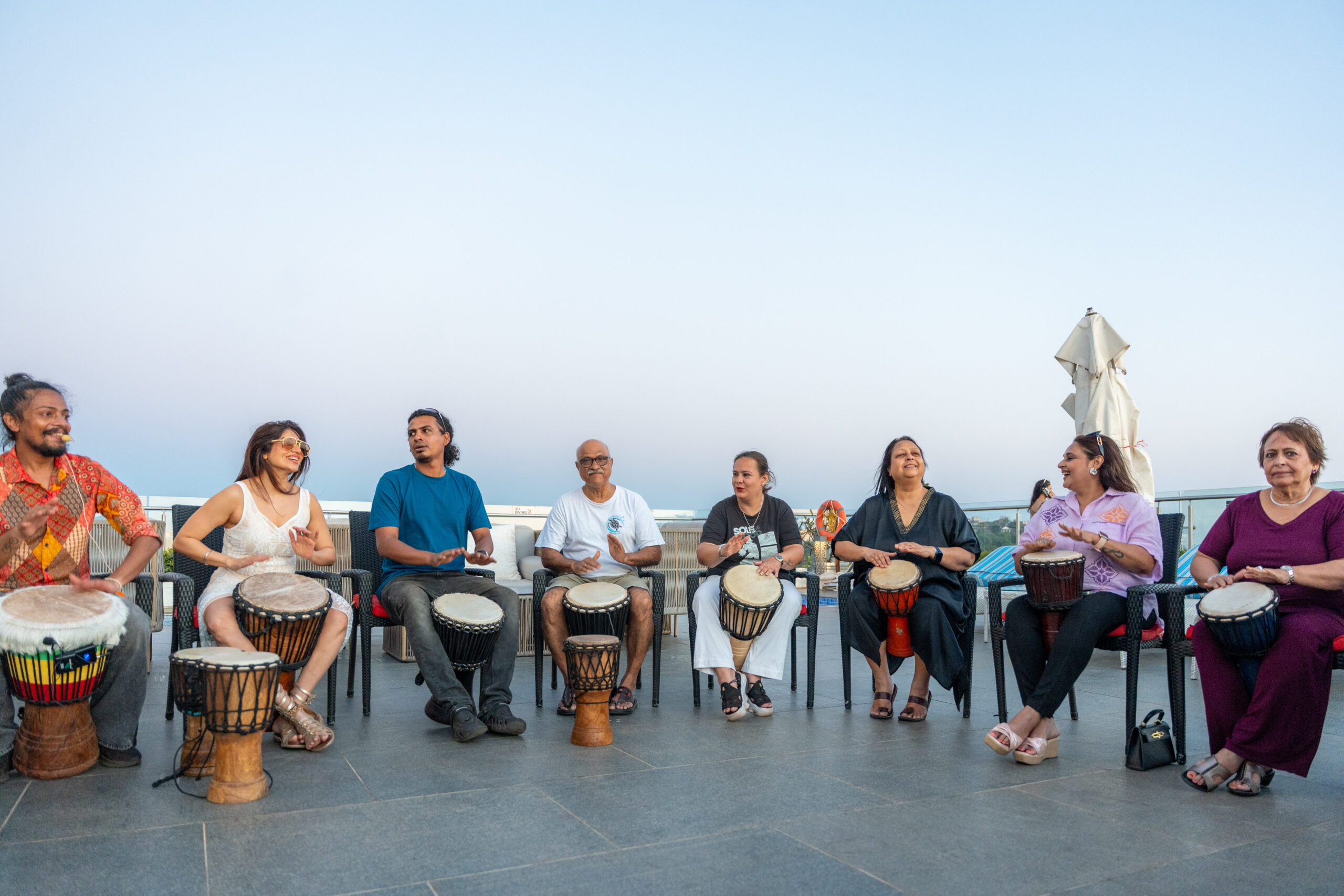 Perched high above the shoreline, the rooftop offers uninterrupted views of the horizon where the Miramar sky and sea dissolve into molten gold. It is here that the beats begin. Guided by professional facilitators, the Drum Circle invites participants to shed inhibition and surrender to rhythm. No musical training is required with just a willingness to feel the pulse. As hands strike the drums in unison, individual rhythms blend into a collective crescendo, mirroring the dramatic colours unfolding across the Arabian Sea.